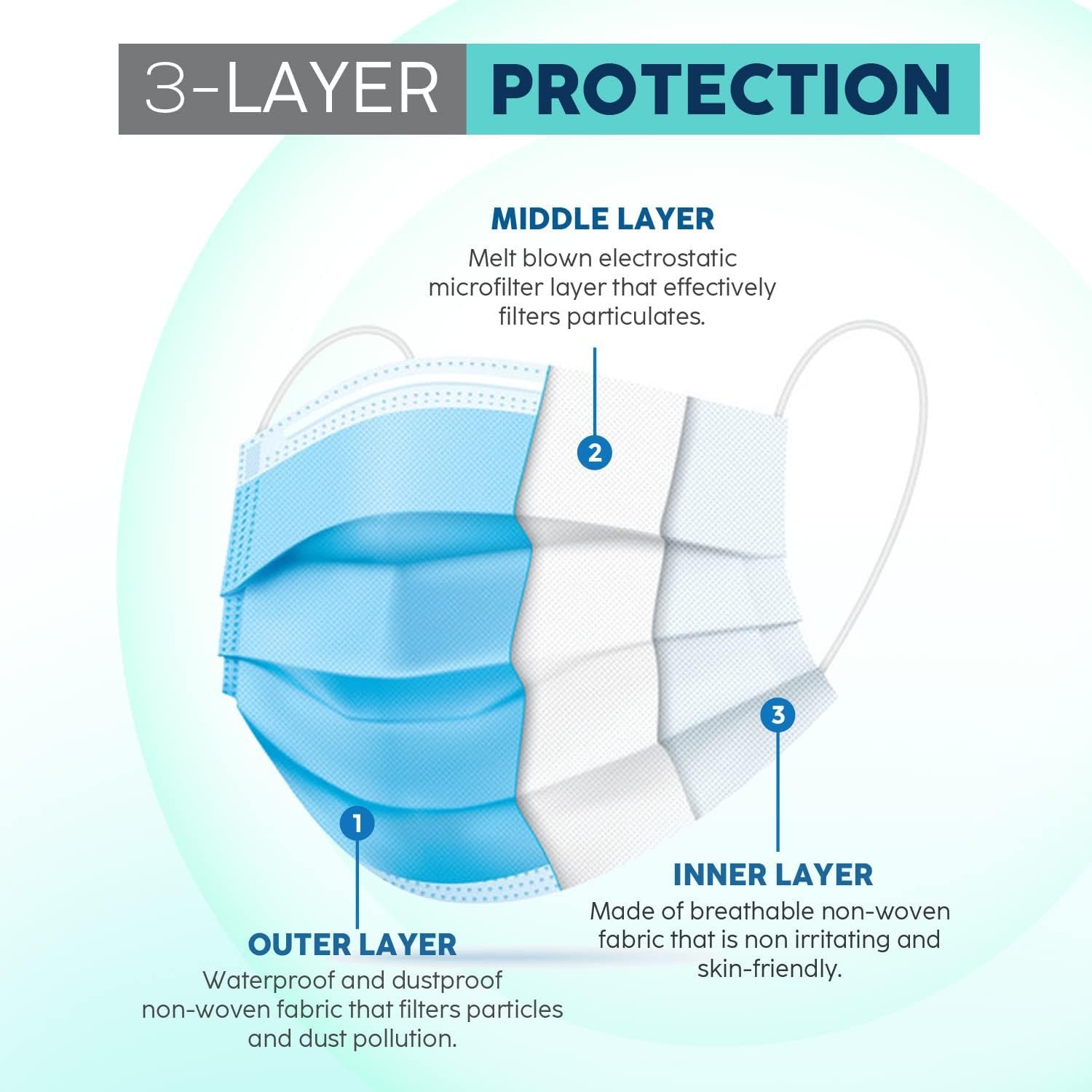 MaterialOuter: Fluid-resistant non-woven; Middle: Melt-blown filter; Inner: Soft non-woven